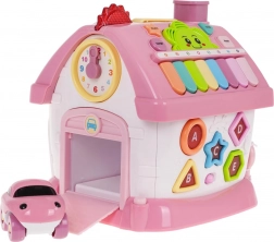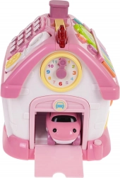 A colorful interactive playhouse for children from 18 months supports learning through play. It features light and sound effects, a piano with 8 keys, a telephone, a clock with moving hands, shape and letter sorting A–E, opening doors and a garage, and a practical handle for easy carrying. It also includes a small toy car for even more fun.
