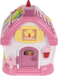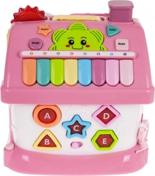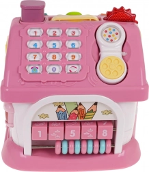 The roof hides a removable phone, numeric keypad, and a piano with eight colorful keys, letting children play melodies and change tones and rhythms. The front features opening doors with doorbell sound and light, while the side walls offer the alphabet A–E with English pronunciation and shape names, rotating elements, and a garage with a pull-out pink toy car.
