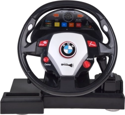 The wheel is equipped with START, STOP, DEMO, and MUSIC buttons, making play even more entertaining. DEMO mode with colorful lighting showcases forward and reverse driving, while the lever lets you choose D1 (fast drive), D2 (very fast drive), N (neutral), and R (reverse). The car has adjustable toe alignment for better stability.