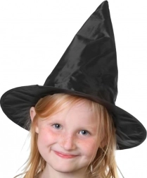 The tall pointed cone and wide brim create the instantly recognizable look of a witch or wizard.