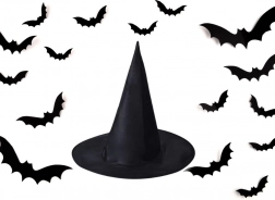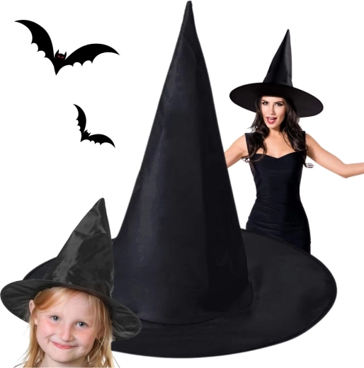 A stylish black witch hat gives your costume the perfect spooky vibe. It features a classic tall cone with a wide brim and is made from a comfortable textile material. Perfect for Halloween, carnivals, and themed parties, and thanks to its one-size fit, it’s easy to wear. You can decorate it with a band, buckle, or cobwebs for an even more magical look and unique design.