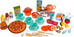 The set includes 65 pieces including kitchen utensils, food, a phone with various effects, and more.