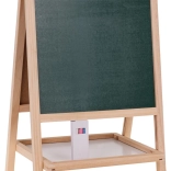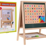Wooden double-sided board for children aged 3 and up. One side is white for drawing with a marker, the other is black for drawing with chalk. The board is magnetic on both sides and includes letters, numbers, and geometric shapes on magnets.