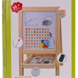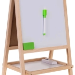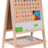 The double-sided wooden board is ideal for creative play and learning for children older than 3 years. One side can be used with markers, while the other side is for chalk drawing. The board is magnetic on both sides, allowing attachment of magnetic letters, numbers, mathematical operations, and spatial shapes. A practical shelf at the bottom of the board makes it easier to store all included accessories.
