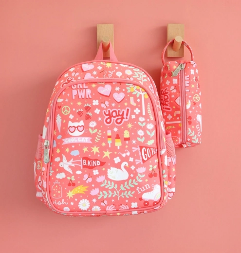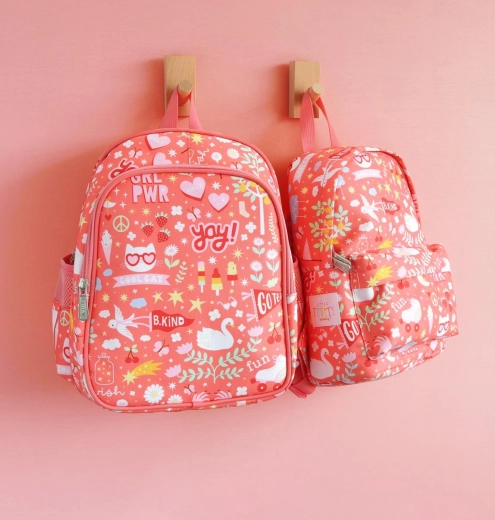 This stylish coral pink backpack with a cheerful print will delight little adventurers. Thanks to the padded shoulder straps, anti-slip chest strap, and breathable padded back panel, it’s comfortable to wear all day. The insulated front pocket keeps snacks and drinks fresh longer, while the side pockets are perfect for a water bottle.