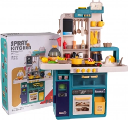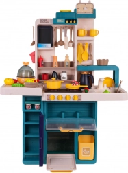 The children's kitchen is made of high-quality plastic and comes in vibrant colors that support children's creativity. It includes an interactive stovetop with turnable knobs that emit cooking and frying sounds, and burners that light up during use. It also features cold steam simulation and realistic running water from the faucet for dishwashing.
