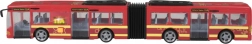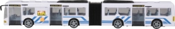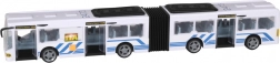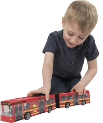 The bus is carefully designed with detailed windows, doors, and a flexible middle, mimicking a real articulated bus.