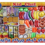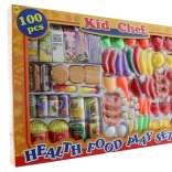 Large food set. The package contains a total of 100 pieces (fruits, vegetables, baked goods, sweets, cans, and carton drinks). Package dimensions approx. 58x39x5 cm. Age 3+.
