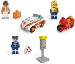 The set includes a rescue car with a tow hook, a motorcycle with a mechanical rattling effect (activated by a yellow button), and traffic signs for safe play. The robust pieces fit small hands and support the development of motor skills, hand–eye coordination, and creative role-play.