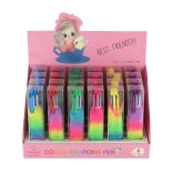 The pen includes 6 colored ink refills - red, yellow, purple, blue, green, and black.