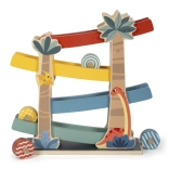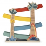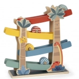 This wooden track with dinosaur motifs is the ideal interactive toy for children. Along with the colorful patterned discs rolling down the ramps, it provides a fun way to learn about movement and gravity. Product features: