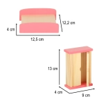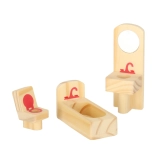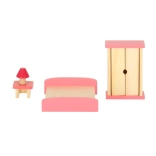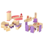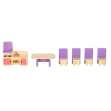 A stylish set of wooden dollhouse furniture in shades of purple and pink will delight every little designer. It includes up to 19 pieces for the living room, bedroom, bathroom, and kitchen. Made from high-quality, smoothly sanded wood and safely lacquered. Supports creativity, fine motor skills, and realistic play.