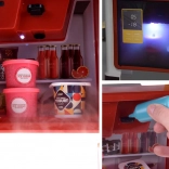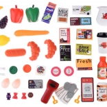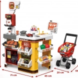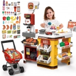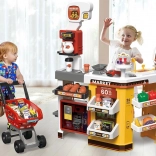 The supermarket for kids is a complete play set that includes many fun features. Equipped with a candy shop, coffee maker, refrigerator, and shopping cart, this play set mimics a real supermarket. The cash register is functional, making realistic sounds and lights, adding authenticity to the play. For an even greater experience, there is a lit refrigerator with mist simulation, like in real freezers.