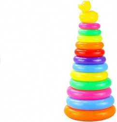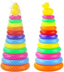 Pyramid of Rings is a classic toy that now comes in a beautifully colored version. It helps to develop not only motor skills and movement abilities of the child but also concentration, manual skills, and provides the opportunity to recognize sizes, sort by size, color shades, or according to one's own rules and logic. With this colorful toy made from safe, soft plastic, your child can have fun even during bath time. A yellow duck placed on top of the pyramid adds more fun. The Pyramid of Rings is an investment for years, opening the world of imagination and development on many levels for your child.