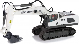 This remote-controlled excavator in white with black accents faithfully replicates a real construction machine. Thanks to 2.4 GHz technology, you avoid interference and enjoy smooth control. The controller with two joysticks allows forward/reverse and left/right driving, cab rotation, and precise bucket operation.
