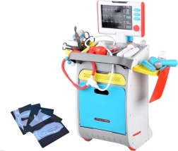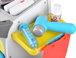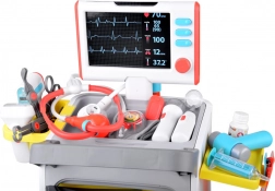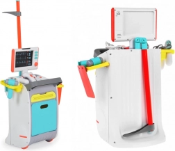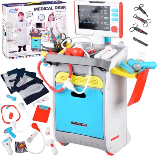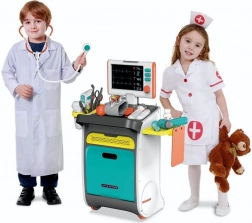 A complete kids' medical set on a rolling trolley brings realistic doctor play from age 3. It includes interactive tools, an EKG/X-ray monitor with sound, a tool washer and sterilizer, storage shelves and drawers, and a height chart up to 112 cm. Sturdy construction and vibrant colors support creative and educational play.