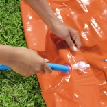Quick and easy setup. Simply unroll the slide on the lawn and connect the hose. Special attachments ensure the slide stays firmly in place.