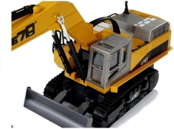 This finely detailed RC excavator faithfully replicates real construction machines: it has a robust build, a cab with protective elements, and an articulated arm ending in a bucket for scooping sand or gravel. Rubber tracks cope with different surfaces and ensure stable driving.