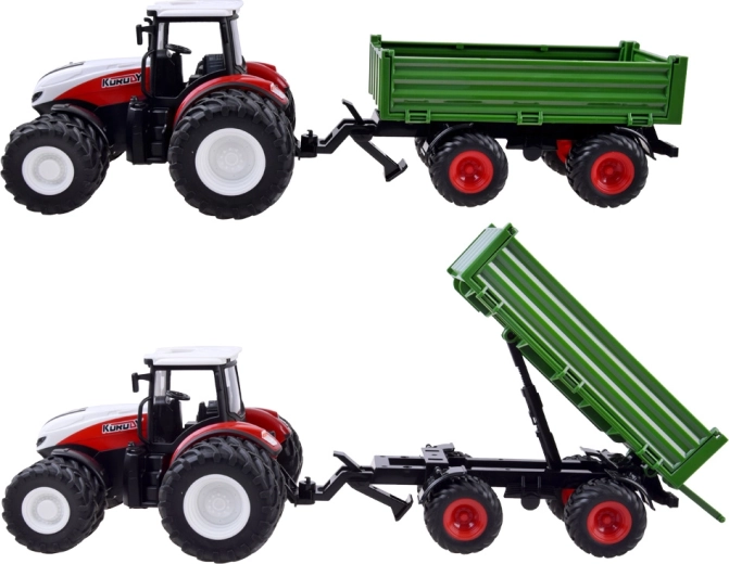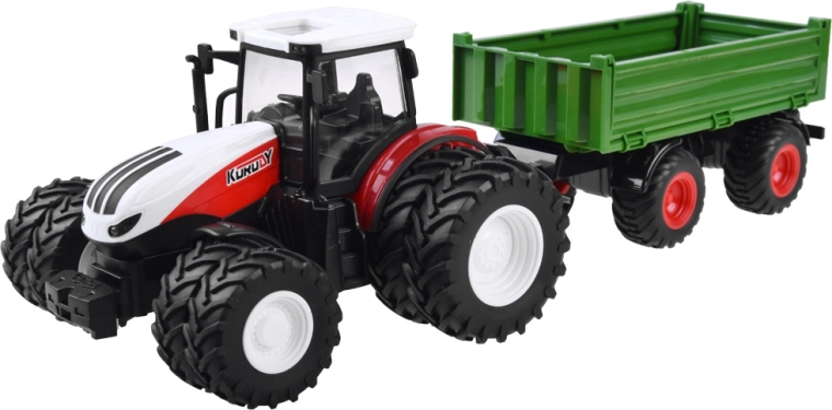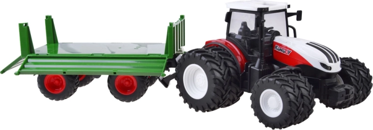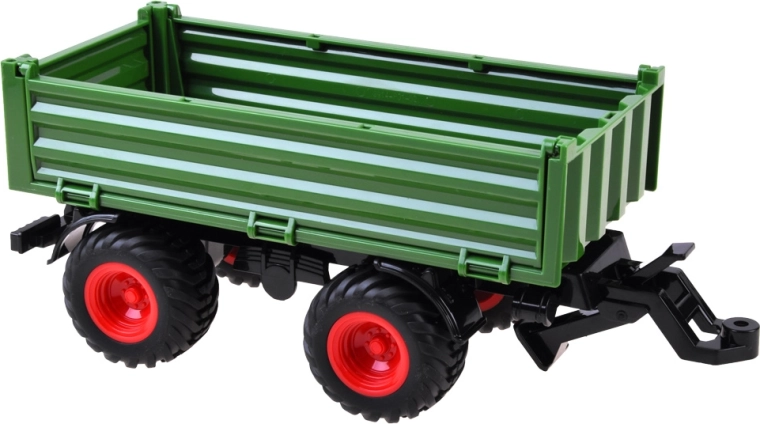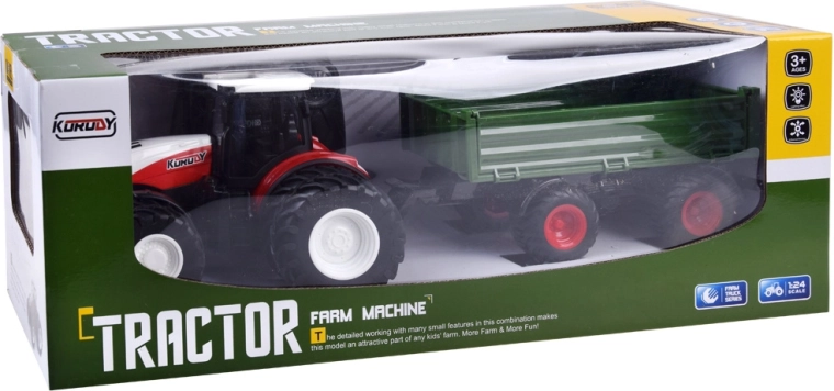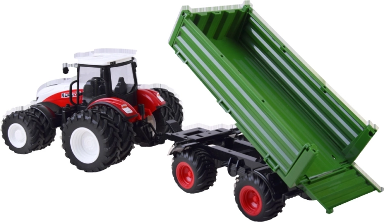 2.4 GHz remote-controlled tractor. The eight-wheel red tractor with a green trailer will satisfy every young tractor user, farmer. Thanks to the remote control, which provides full control of the tractor, any work of the little farmer will be effortless and under full control. The remote control allows driving forward, backward, and turning left and right.