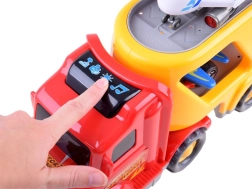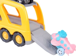 A colorful children’s transporter for planes and cars brings hours of creative play. The tractor unit with trailer has a button for lights and sounds, a friction drive for easy start, and a folding ramp for convenient loading. Durable plastic construction and vibrant colors support the development of imagination and motor skills.