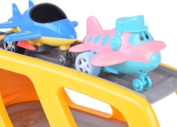 The set includes three airplanes and a helicopter, which can be easily loaded using the tilting ramp. The robust plastic design in vivid colors is safe and durable for everyday play.