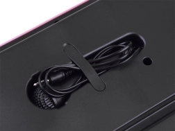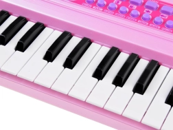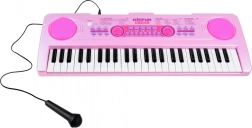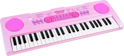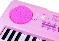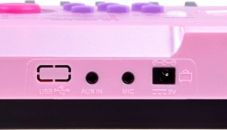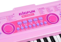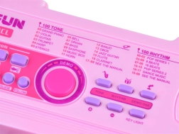 Pink children's BIGFUN keyboard with backlit keys brings fun music learning for little musicians. It offers 49 keys, 100 tones, 100 rhythms, 50 demo songs, recording and playback, tempo and volume control. Includes a microphone, USB power, and inputs for MIC and AUX.