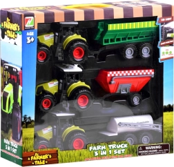 The set includes 3 tractors and 3 different trailers. Kids can easily attach and detach the trailers and create their own setups for varied farm-themed fun.