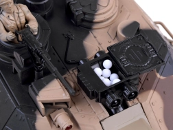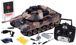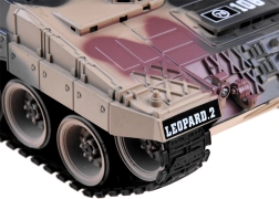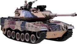 Discover the finely detailed RC tank LEOPARD 2, faithfully replicating a real combat vehicle. Its robust build with functional tracks handles tougher terrain, while the rotating turret and adjustable barrel add authenticity. Enjoy realism with firing sounds, a recoil effect, and front LED lighting.