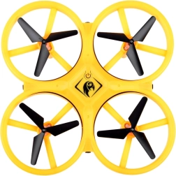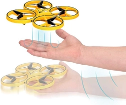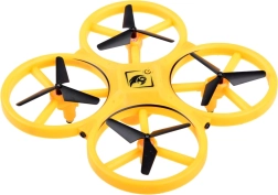 The toy activates by pressing and holding the button located on the drone. The pilot watch requires the same action. Place the drone on a flat surface and wait for the light to change from flashing to steady - after pairing the bracelet and toy, we start the drone, which will take off to a height of approx. 1.5 meters. If the drone is nearby, it needs to be taken out of reach. 120 cm. Further controlling with hand gestures sets the flight direction of the toy. Starting or ending the flight is performed with a button that is controlled with the index finger— the control range is 50-80 m, depending on the terrain.
