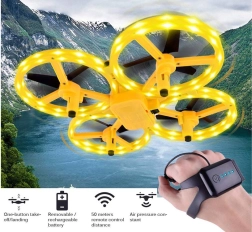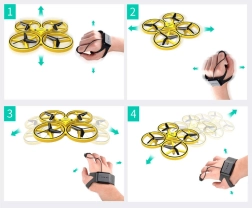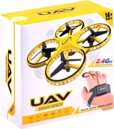Quadcopter UAV Gravity Sensor - is an entertaining offer for children and older ones who like flying toys. The fully plastic-made drone features fantastic LED lighting, which presents greatly in dim light. The drone is controlled with a special remote that is attached to the hand like a watch. It is operated by hand gestures and offers wide maneuvering options, a gentle hand motion is enough to change the flight direction, right-left, up-down. After launch, it stays in the air and spins 360 degrees on its own axis. The strap should be placed on the arm, move it between the thumb and fasten it with a button on the index finger. The silicone strap has 12-step width adjustment which will fit everyone. The toy is light and thus quickly ascends into the air, with 4 opposing wings increasing its stability during flight.