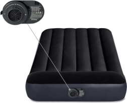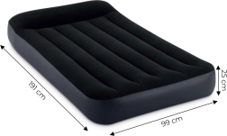 Practical INTEX inflatable mattress for one person with dimensions 191 × 99 × 25 cm, an integrated electric pump for quick inflation and deflation, a pleasant velvety (velour) surface, and a durable Fiber-Tech/Dura-Beam construction. Ideal for home and travel, with a maximum load capacity of 136 kg and a contoured pillow rest for extra comfort.