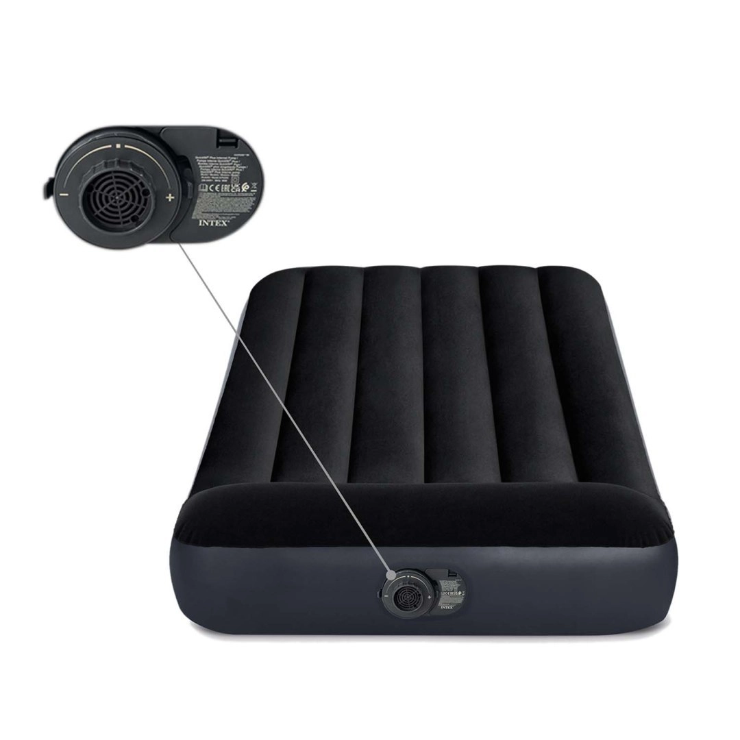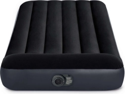 Enjoy comfortable sleep anywhere. This single inflatable INTEX bed combines durable PVC with a pleasant, water-resistant velour that prevents sheets from slipping and increases comfort. The integrated pump saves you time – the mattress inflates in moments and is just as easy to deflate.