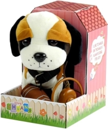 The interactive brown and white St. Bernard on a leash is made of soft and eco-friendly material that is pleasant to the touch. It features large dark eyes, a prominent tail, and a distinctive nose. The toy includes a long leash with a switch, allowing the child to easily control their pet. The dog dances and sings, adding fun and realism to the play.