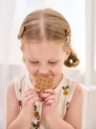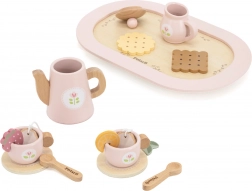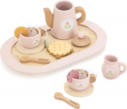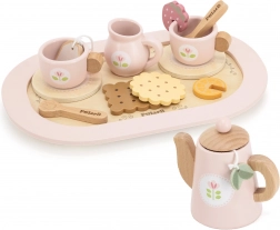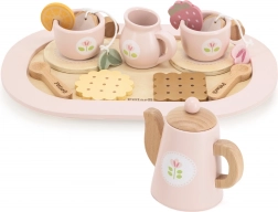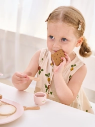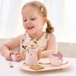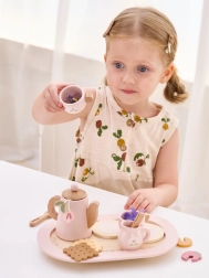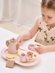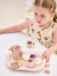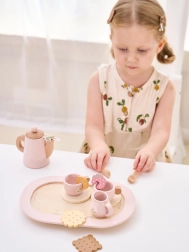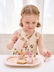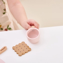 The set offers everything needed for serving: a teapot with lid, cups with saucers, a milk jug, spoons, tea bags, fruit slices, and fragrant “cookies,” all on a practical tray. Thanks to its composition of pieces, it is a great addition to a Montessori-inspired kids’ room and a lovely gift that will delight every little host.