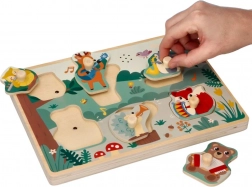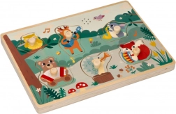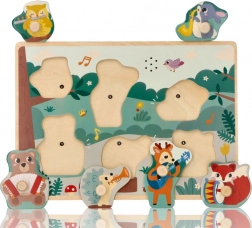 This wooden sound peg puzzle with a forest theme introduces children to musical instruments in a playful way. Each colorful animal piece has a practical peg for easy holding, and when placed in the correct spot it plays the corresponding sound, motivating repeated play and discovery.