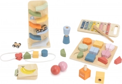 This carefully curated VIGA set for ages 18–24 months combines favorite wooden toys into a harmonious whole. It includes a xylophone for first musical experiments, a fun car ramp track, shape puzzles, threaded pieces, lacing shapes, and a wooden picture book with fruit. Each element is designed to support a child’s natural development through play.