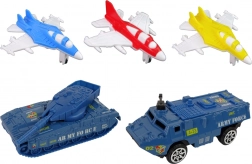 Three colorful fighter jets, a tracked tank, and an armored vehicle with a metal body bring action both at sea and on land.
