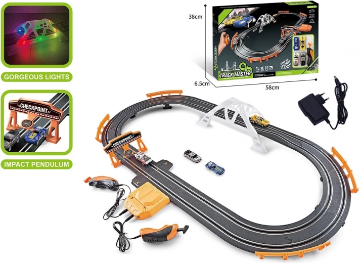 Stunning racing track in 1:64 scale is an ideal choice for both small and big fans of car experiences. Illuminated bridge and the possibility of body exchange on the 2 included cars ensure that every race is exciting and customizable to your preferences.