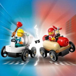 The LEGO CITY play set includes a tall ramp, two unique race cars (hot dog and toilet), and 4 minifigures, including the drivers—a hot-dog vendor and a plumber. Kids can easily place the cars at the top of the ramp, push the lever, and watch them speed off the start line. A great choice for solo or shared play.