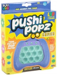 Discover the fun interactive toy Pushi Popz with popping bubbles and cheerful sounds that motivate kids to play. The compact design is ideal for travel, develops dexterity, memory, and hand–eye coordination, and also helps reduce stress. It offers 4 game modes and runs on 3× AAA batteries (included).