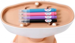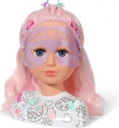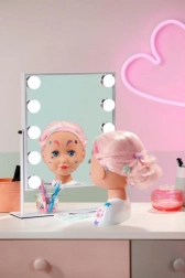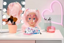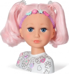 Discover endless crafting possibilities with the BABY BORN 22 cm styling head. Thanks to the long pink hair made of high-quality nylon, colored markers, a stencil, and a set of snap-on decorations, kids will enjoy hours of creative fun—from hairstyling and makeup to decorating the T-shirt and headband.