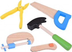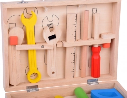 A hammer, saw, pliers, screwdriver, wrenches, ruler, and more parts imitate real tools while remaining safe for children’s play.