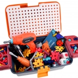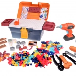 - case with perforated lid, kids’ drill/screwdriver, manual screwdriver, wrenches (open-end/ring, adjustable), pliers, screwdriver bits, gears, hole plates, screws and bolts, nuts, construction parts (rings, triangles, etc.), removable compartments, inspiration booklet