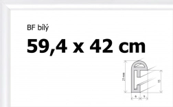The picture frame includes glass with polished edges of 2 mm thickness and a basic backing with two hangers that allow hanging vertically and horizontally. The profile of the plastic frame has a height of 21 mm and the frame format corresponds to the standard A2 (59.4 x 42 cm).