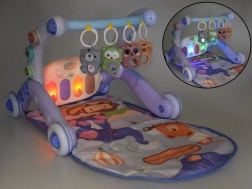 - Mat, push walker, musical piano, 5 hanging toys/rattles, 6 pastel blocks for the sorter