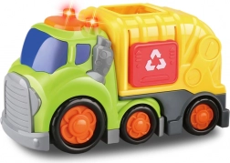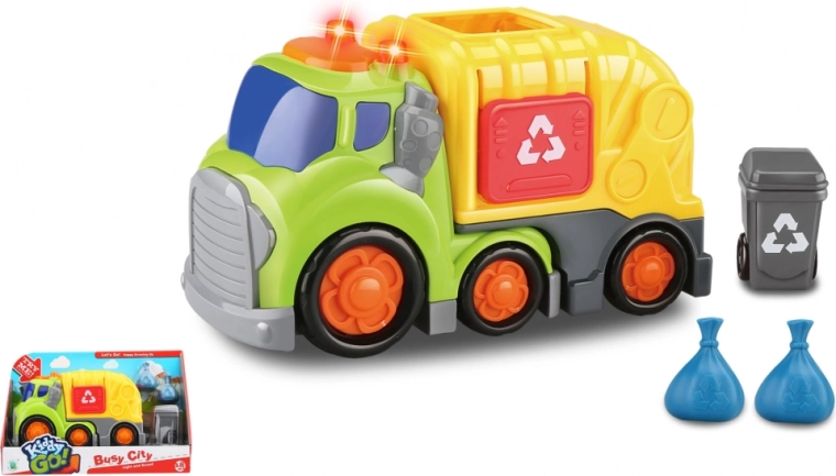 Kiddy Go! garbage truck with light and sound effects, opening cargo compartment, and free-rolling wheels. Includes a trash bin and garbage bags, 2× AA batteries are included. Suitable from 18 months.