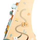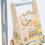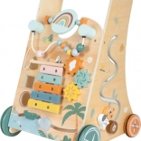 Set off on a safari adventure with this baby walker featuring three sides full of safari-themed activities. Children will enjoy interacting with the elephant, crocodile, toucan, lion, tiger, zebra, and their friends. The five-key wooden xylophone provides auditory stimulation, while sliding elements and the bead maze help develop fine motor skills.