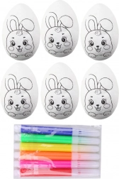 Creative set for children and adults: 6 polystyrene eggs with a bunny pattern and colorful markers for easy decorating. Ideal for Easter decorations, egg painting, and fine motor skill development. The eggs have a smooth surface ready for painting and decorating, making crafting fun, safe, and quick.