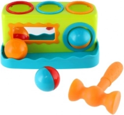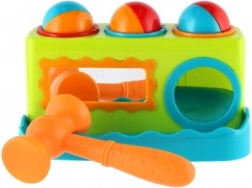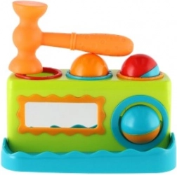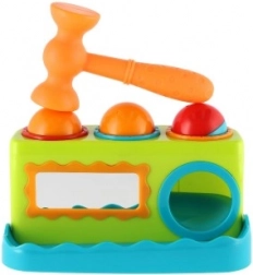 This colorful 21 cm plastic hammering bench is a great choice for first developmental play. Children safely hammer three balls into the prepared holes, training grip, strength, and accuracy. The integrated mirror on the front increases interaction and fun.