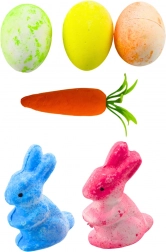 This set includes colorful eggs, bunnies, and carrots, giving it a classic Easter look.